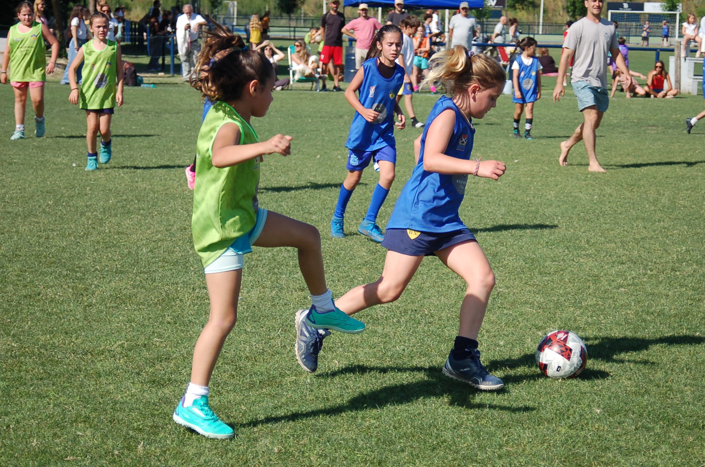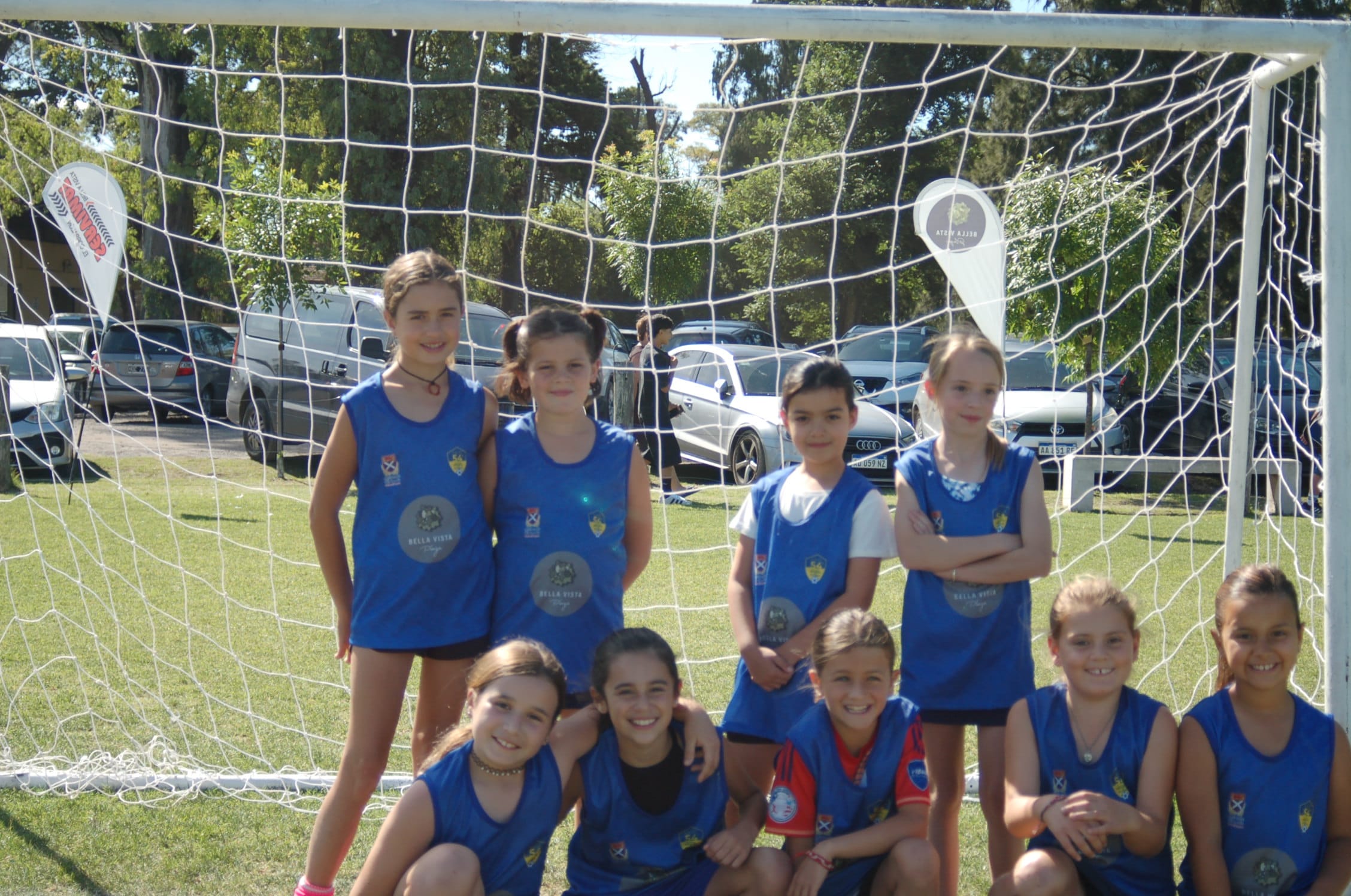 El partido arrancó y los alientos de las familias motivaban a ambos equipos. Al principio, estaba muy peleado, Pocahontas atacaba con mucha energía, pero Blancanieves recuperaba y contraatacaba. En una jugada donde la pelota estaba trabada en el medio, Catalina Muñiz (P) logró destrabarla, corriendo sola hacia el arco y clavó un golazo en el ángulo inferior derecho. En todo momento los directores técnicos daban instrucciones y alentaban a sus jugadoras, dándoles más confianza. Unos minutos más tarde, Catalina Muñiz, luego de un pase de Margarita Lamas, se enfrentó al arco pero, cuando intentó definir, Emma Dominguez, la arquera de Blancanieves, se tiró y evitó el segundo gol de Pocahontas. Blancanieves siguió insistiendo pero el silbato sonó marcando el final del primer tiempo.